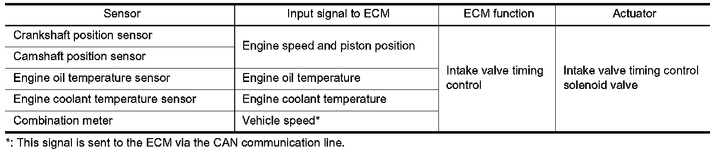 The ECM receives signals such as crankshaft position, camshaft position, engine speed, and engine coolant temperature. Then, the ECM sends ON/OFF pulse duty signals to the intake valve timing control solenoid valve depending on driving status. This makes it possible to control the shut/open timing of the intake valve to increase engine torque in low/mid speed range and output in high speed range.