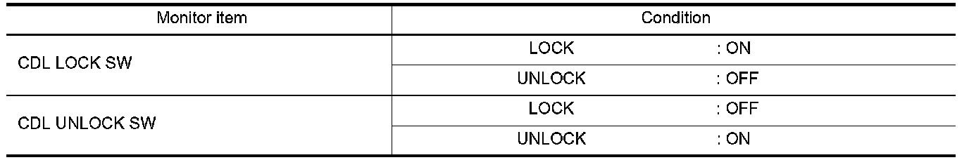 Check ("CDL LOCK SW ", "CDL UNLOCK SW") in "DATA MONITOR" mode for "POWER DOOR LOCK SYSTEM" with CONSULT-III. Consult-III Function.