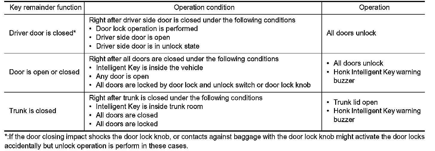 - The above function operates when the Intelligent Key is inside the vehicle. However, there may be times when the Intelligent Key cannot be detected, and this function does not operate when the Intelligent Key is on the instrument panel, rear parcel shelf, or in the glove box. Also, this system sometimes does not operate if the Intelligent Key is in the door pocket for the open door.