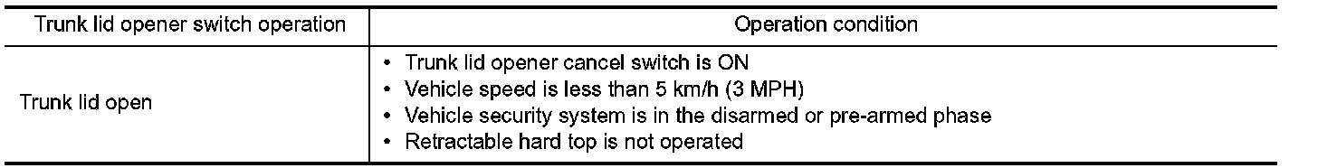 - When trunk lid opener switch turns ON, BCM transmits trunk lid open request signal to retractable hard top control unit.