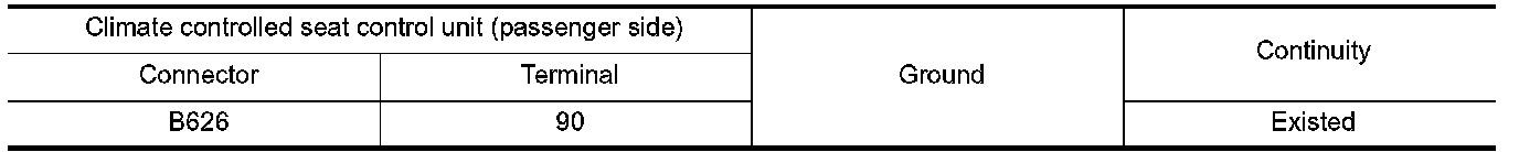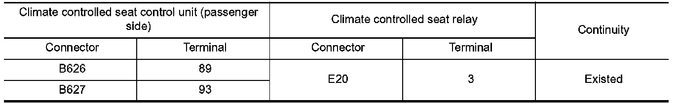 3.Check continuity between climate controlled seat control unit (passenger side) harness connector and climate controlled seat relay harness connector.