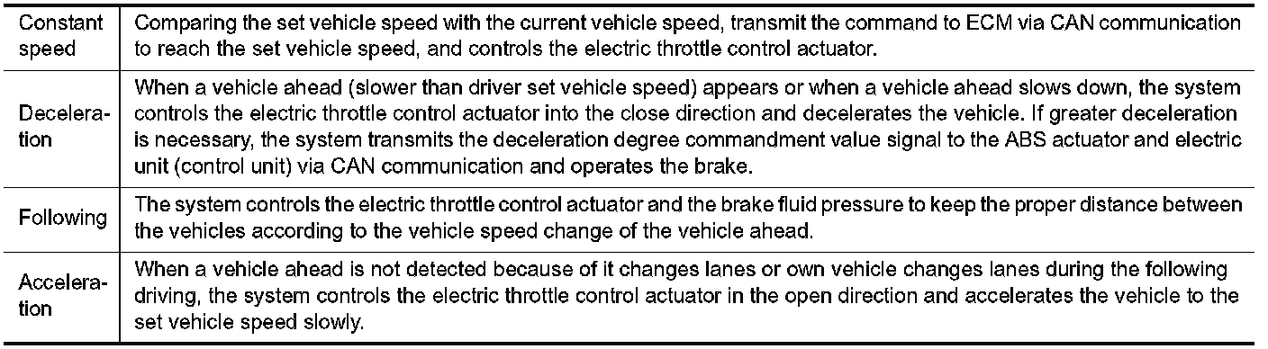 The following items are controlled in the vehicle-to-vehicle distance control mode.