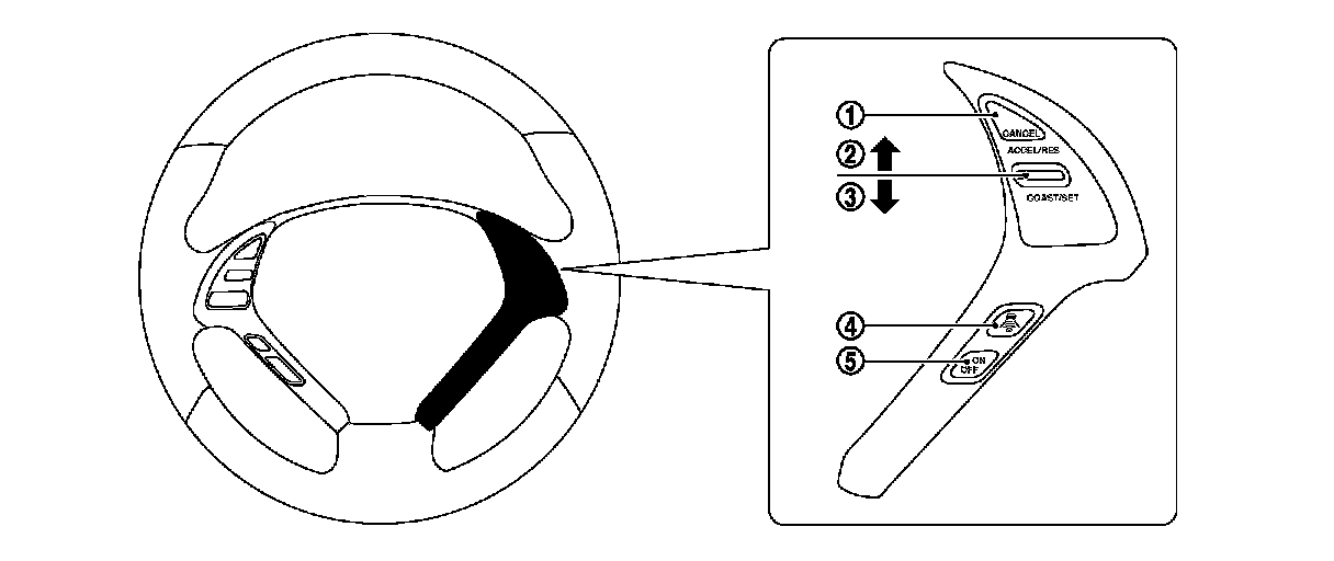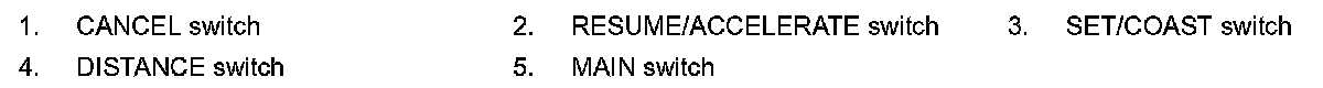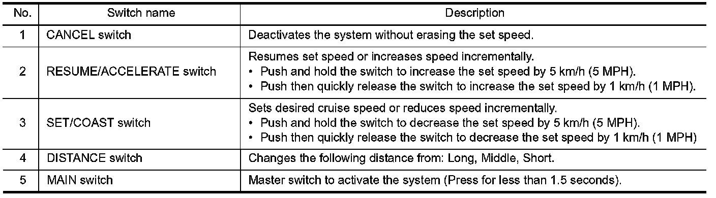 If the system is canceled by conditions 1-4 below, the system will resume control at the last set cruising speed by pushing up the RESUME/ACCELERATE switch.