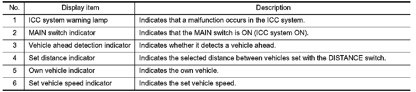 The MAIN switch indicator, set distance indicator, own vehicle indicator, and set vehicle speed indicator come on and ICC system is set to a standby state.