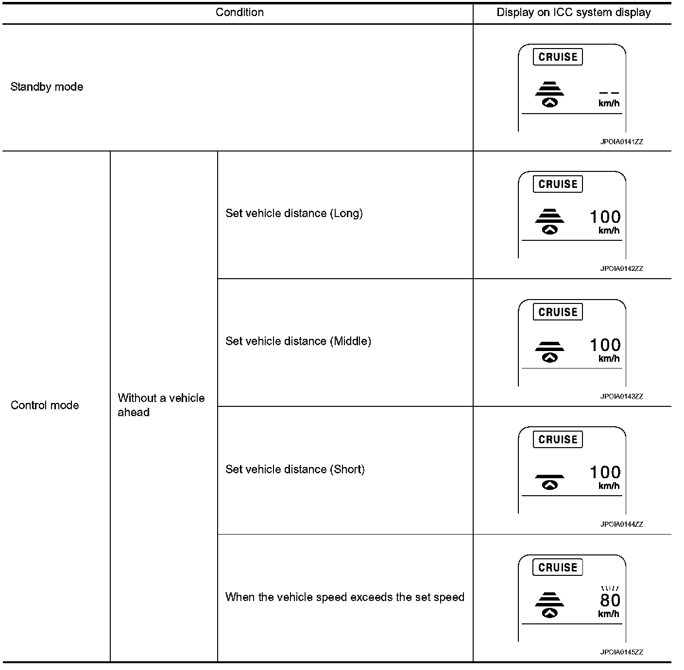 - When there are no vehicles traveling ahead, the vehicle-to-vehicle distance control mode maintains the speed set by the driver. The set speed range is between approximately 40 and 144 km/h (25 and 90 MPH).