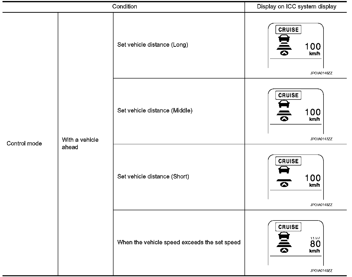- When there is a vehicle traveling ahead, the vehicle-to-vehicle distance control mode adjusts the speed to maintain the distance, selected by driver, from a vehicle ahead. The adjusting speed range is between approximately 32 km/h (20 MPH) and up to the set speed.