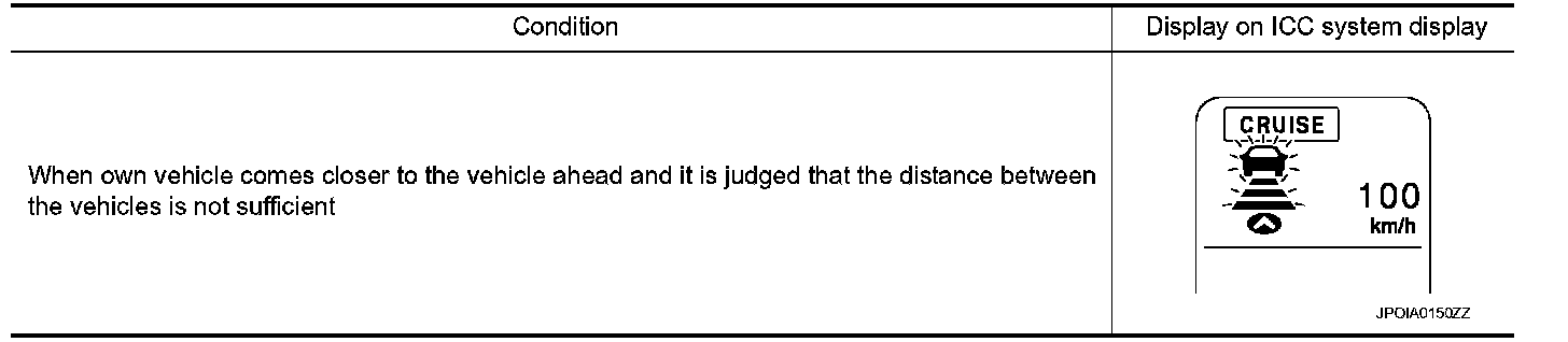 If own vehicle comes closer to a vehicle ahead due to rapid deceleration of that vehicle or if another vehicle cuts in, the system warns the driver with the chime and ICC system display. Decelerate by depressing the brake pedal to maintain a safe vehicle distance if: