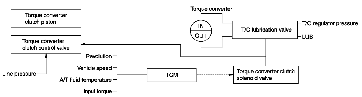 The torque converter clutch control valve operation is controlled by the torque converter clutch solenoid valve, which is controlled by a signal from TCM, and the torque converter clutch control valve engages or releases the torque converter clutch piston.