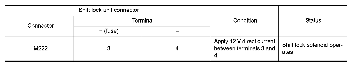Apply voltage to terminals 3 and 4 of shift lock unit connector, and then check that shift lock solenoid is activated.
