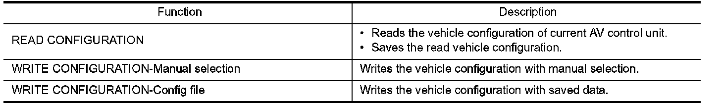 - Since vehicle specifications are not included in the AV control unit after replacement, it is required to write vehicle specifications with CONSULT-III.