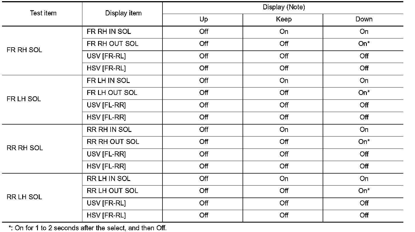 - Select "Up", "Keep" and "Down". Then use screen monitor to check that solenoid valve operates as shown in the table below.