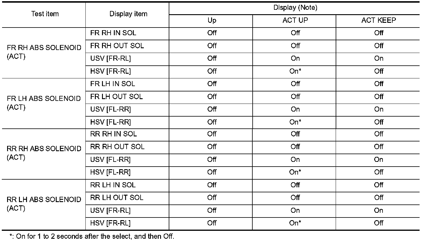 - Select "Up", "ACT UP" and "ACT KEEP". Then use screen monitor to check that solenoid valve operates as shown in the table below.