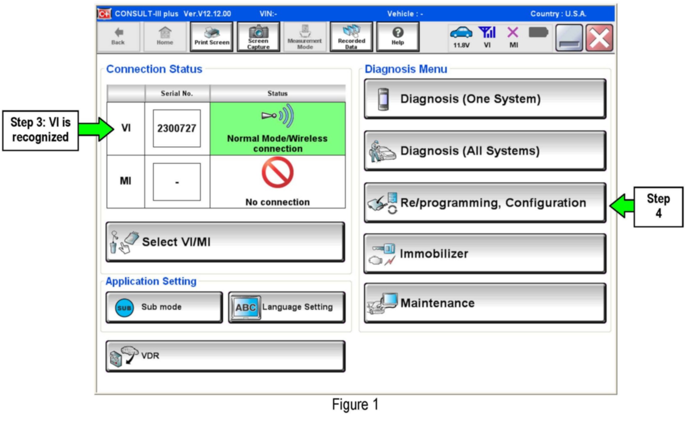 1. Connect the CONSULT PC to the vehicle to begin the reprogramming procedure.