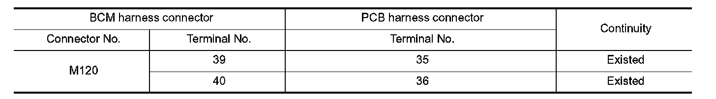 2.Check the continuity between the BCM harness connector and the PCB harness connector.