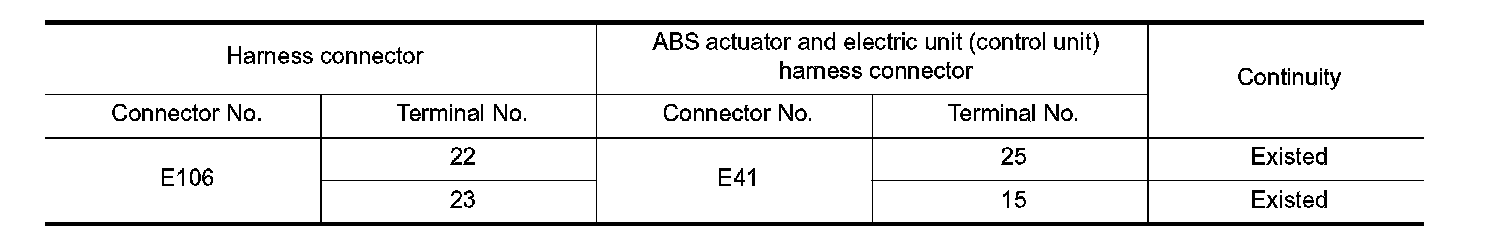 NO- Repair the main line between the harness connector E106 and the ABS actuator and electric unit (control unit).