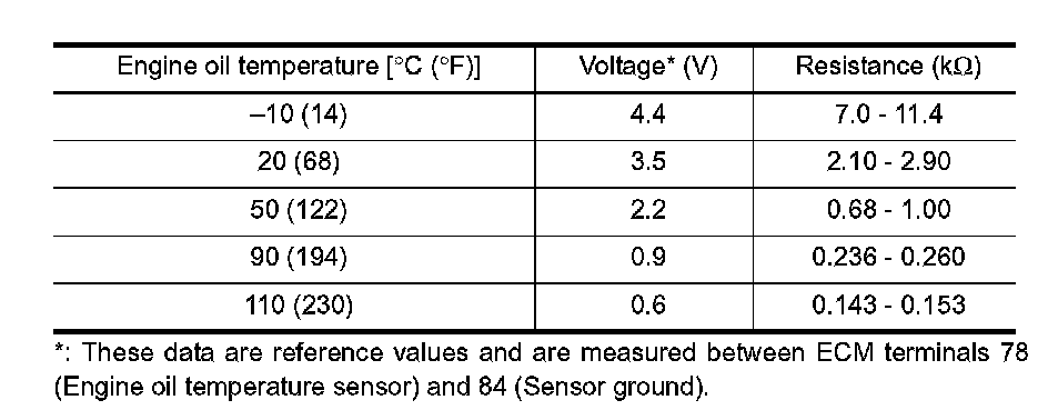 The engine oil temperature sensor is used to detect the engine oil temperature. The sensor modifies a voltage signal from the ECM.