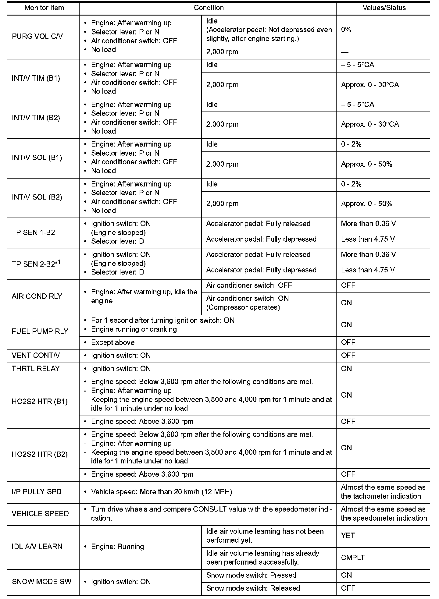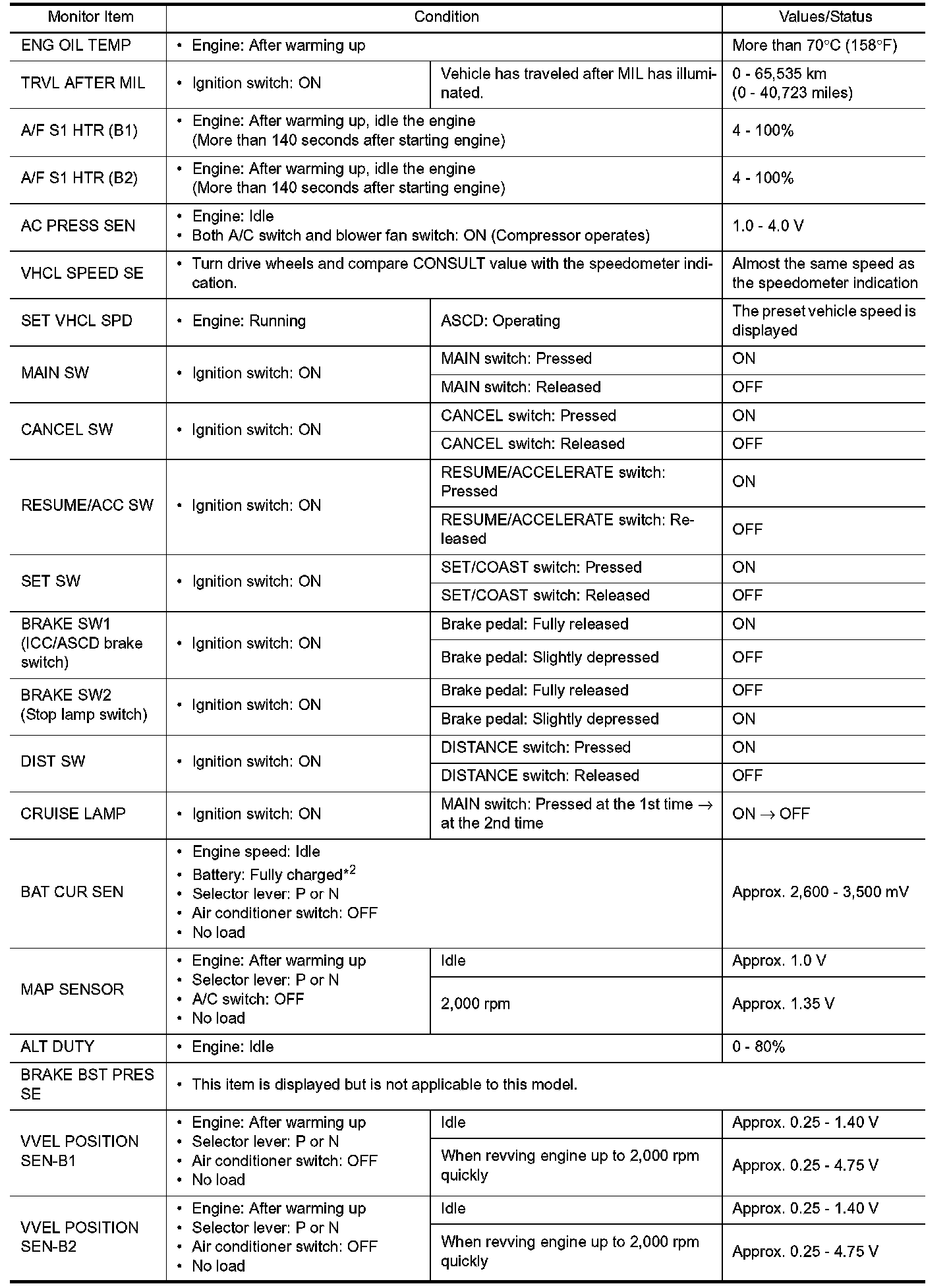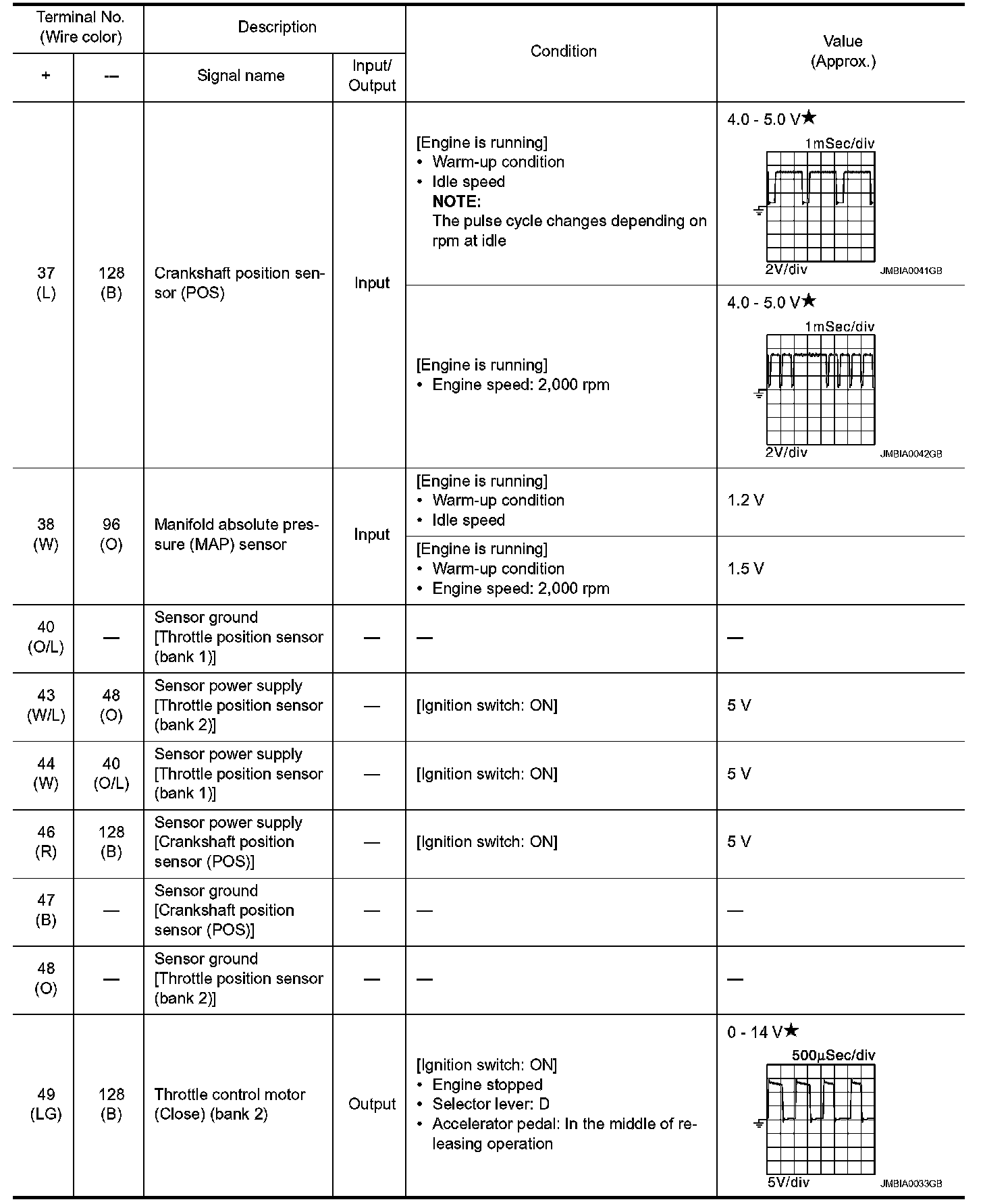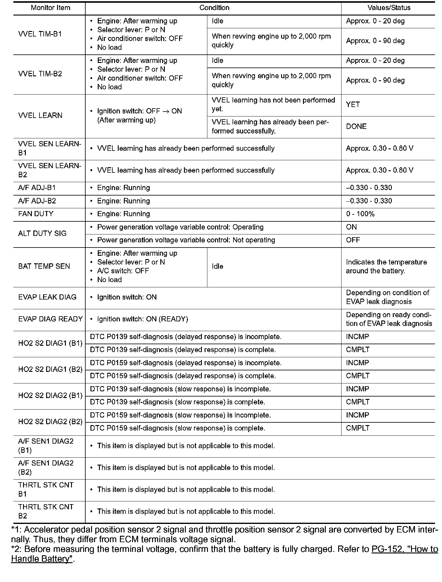 *1: Accelerator pedal position sensor 2 signal and throttle position sensor 2 signal are converted by ECM internally. Thus, they differ from ECM terminals voltage signal.