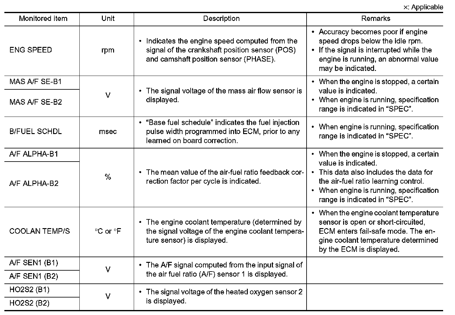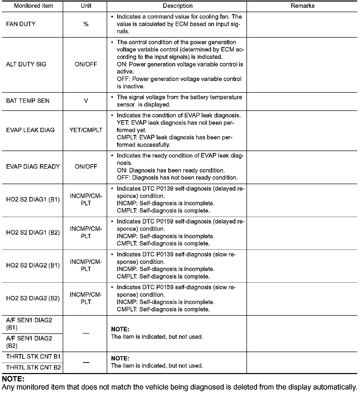 Any monitored item that does not match the vehicle being diagnosed is deleted from the display automatically.