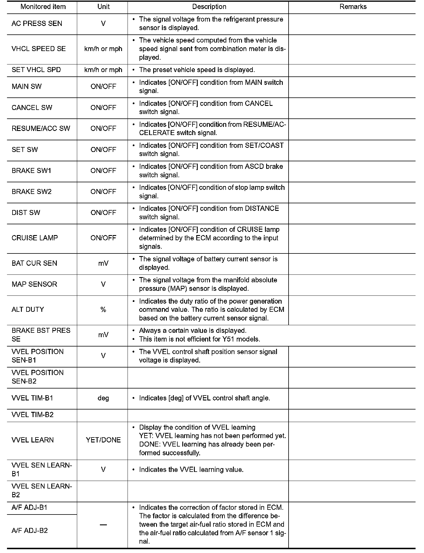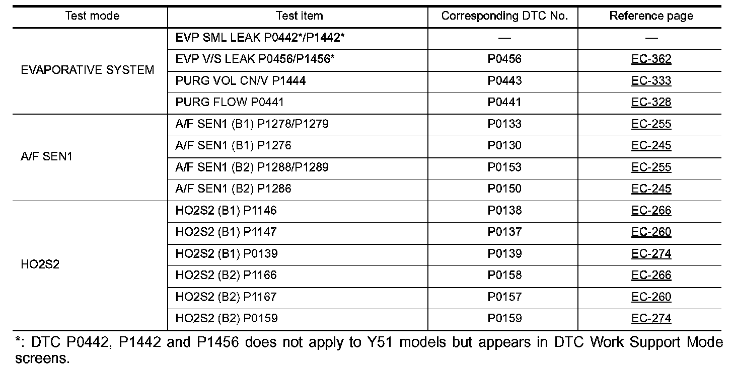 *: DTC P0442, P1442 and P1456 does not apply to Y51 models but appears in DTC Work Support Mode screens.