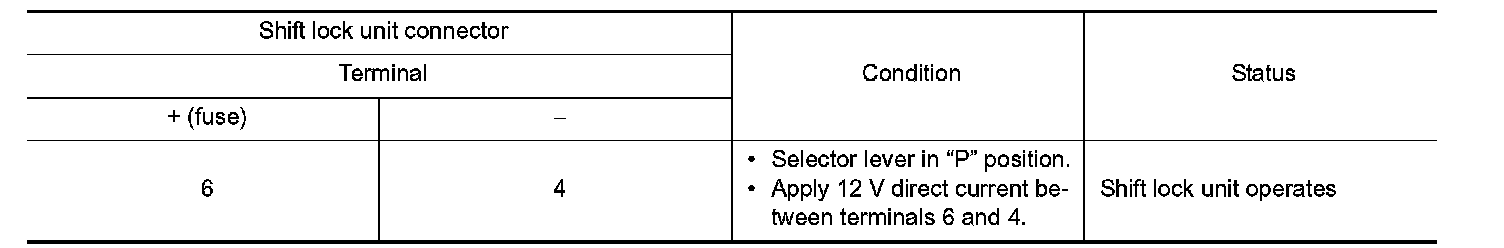 Apply voltage to terminals 6 and 4 of A/T shift selector connector, and check that shift lock unit is activated.