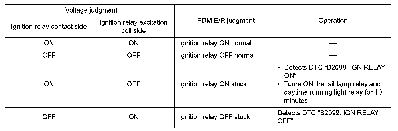 - IPDM E/R judges the ignition relay error if the voltage differs between the contact circuit and the excitation coil circuit.