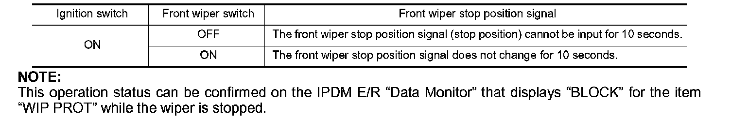 When a front wiper stop position signal is in the conditions listed below, IPDM E/R stops power supply to wiper after repeating a front wiper 10 seconds activation and 20 seconds stop five times.