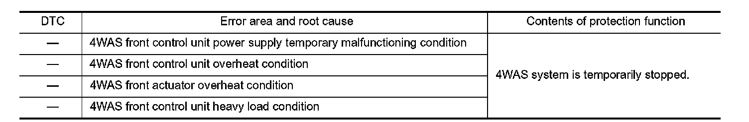 4WAS system enters in the protection function mode (4WAS system is temporarily stopped) if 4WAS system continues the heavy load condition and the overheat condition.4WAS system reactivates automatically if the heavy load condition and the overheat condition are resolved.4WAS warning lamp continues turning OFF in the protection function mode.