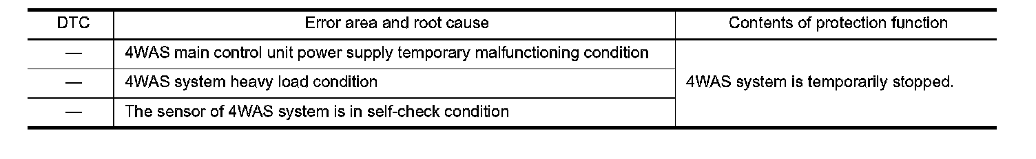 4WAS system enters in the protection function mode (4WAS system temporarily stopped) if 4WAS system continues the heavy load condition or the sensor self-check condition. (4WAS system reactivates automatically if the heavy load condition and the self-check condition are resolved.) 4WAS warning lamp stays OFF in the protection function mode.