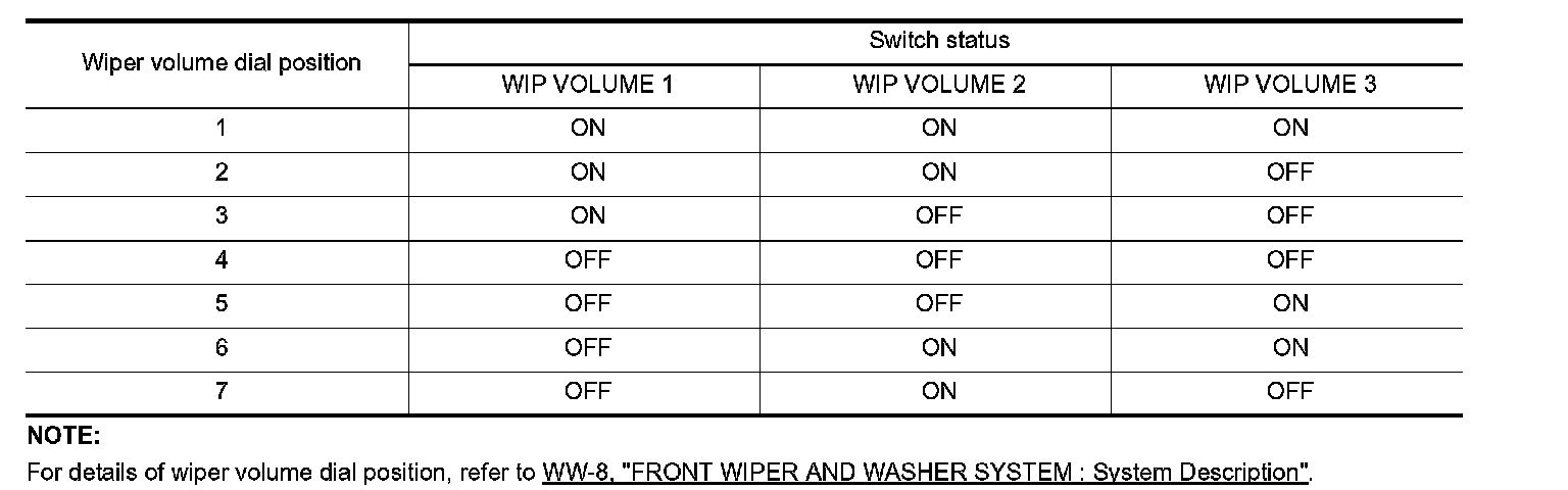 BCM judges the wiper volume dial 1 - 7 by the status of WIP VOLUME 1, 2 and 3 switches.