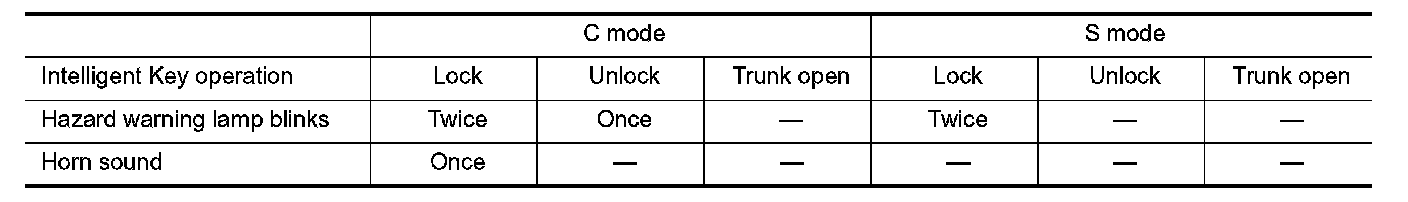 When LOCK and UNLOCK signals are sent from the Intelligent Key for more than 2 seconds at the same time, the hazard and horn reminder mode is changed and hazard warning lamp blinks and horn sounds as per the following items: