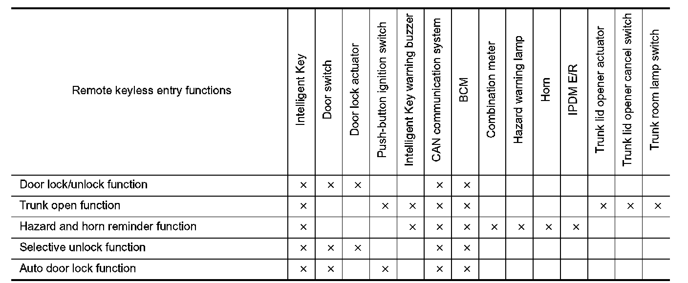- When BCM receives the door lock/unlock signal, it operates all door lock actuators and fuel lid lock actuator the hazard lamp (lock: 2 times, unlock: 1 time) and horn chirp signal to IPDM E/R at the same time as a reminder.