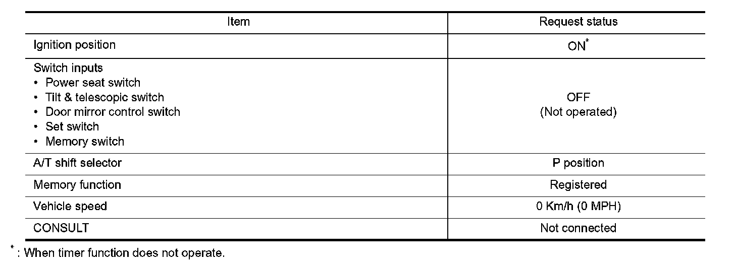 - Satisfy all of the following items. The timer function is not performed if these items are not satisfied.