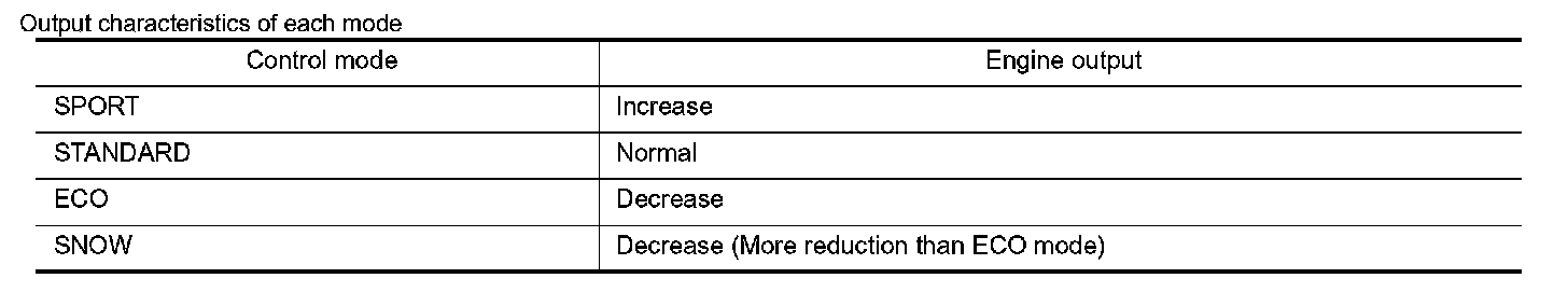 - Engine output characteristics after switching mode by operating the drive mode select switch are as follows.
