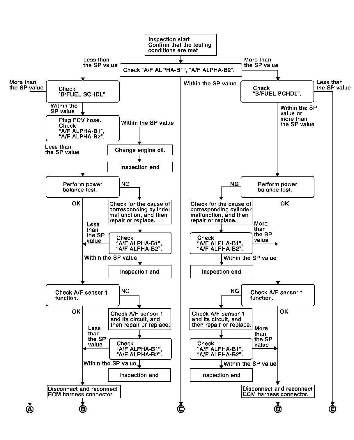 Select "A/F ALPHA-B1", "A/F ALPHA-B2" and "B/FUEL SCHDL" in "SPEC" of "DATA MONITOR" mode, and check that each indication is within the SP value.