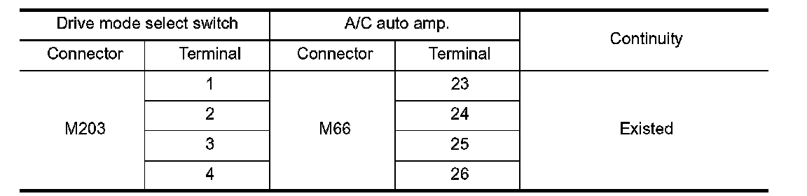 3.Check continuity between drive mode select switch harness connector and A/C auto amp. harness connector.