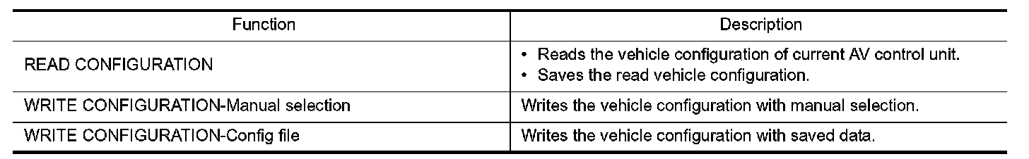 - Since vehicle specifications are not included in the AV control unit after replacement, it is required to write vehicle specifications with CONSULT.