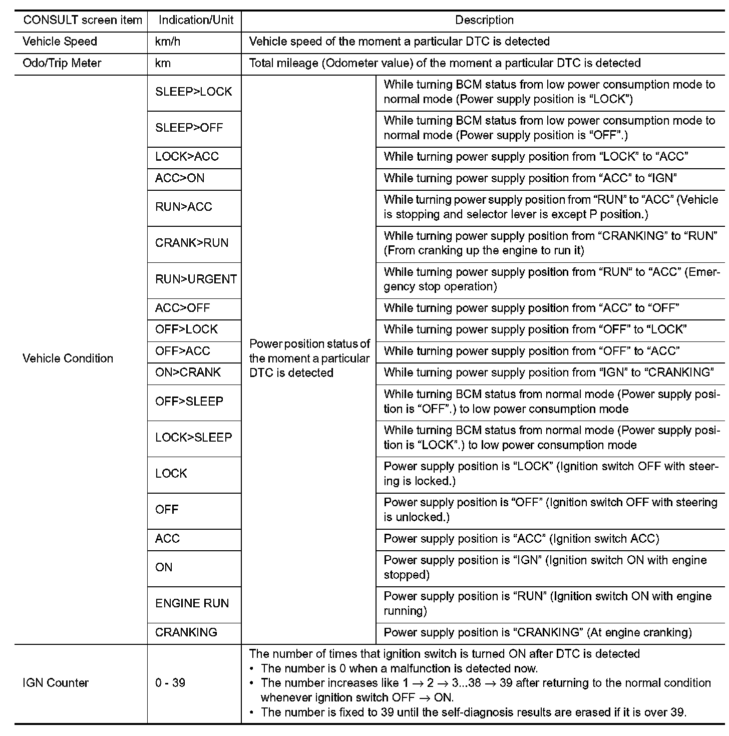 The BCM records the following vehicle condition at the time a particular DTC is detected, and displays on