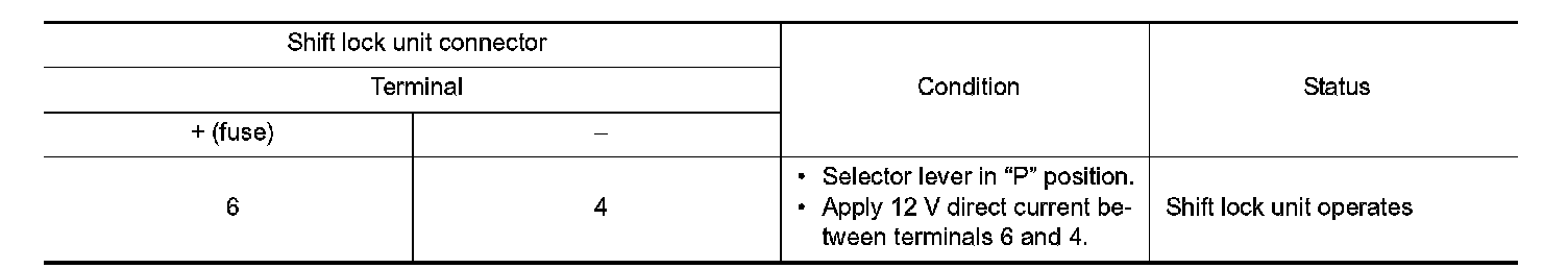 Apply voltage to terminals 6 and 4 of A/T shift selector connector, and check that shift lock unit is activated.