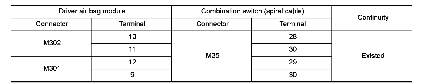 3.Check continuity between driver air bag module harness connector and combination switch (spiral cable)