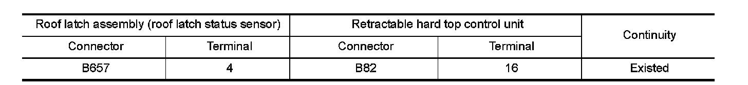 3.Check the continuity between roof latch assembly (roof latch status sensor) harness connector and retractable hard top control unit harness connector.
