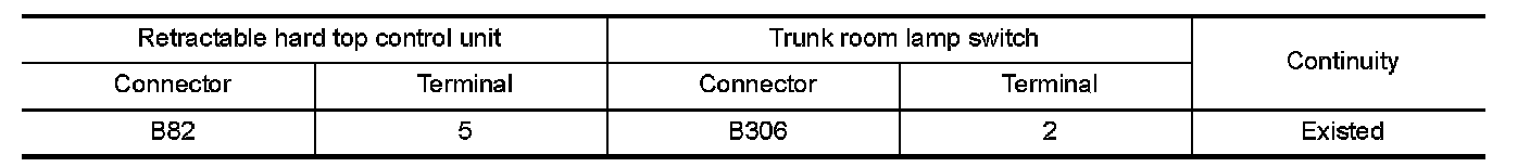 2.Check continuity between retractable hard top control unit harness connector and trunk room lamp switch harness connector.