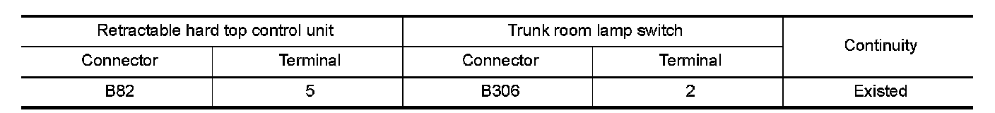 2.Check continuity between retractable hard top control unit harness connector and trunk room lamp switch harness connector.