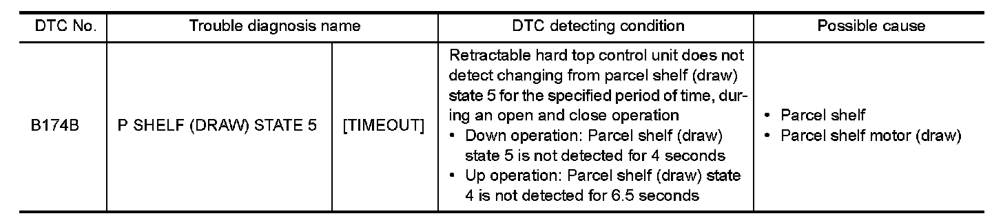 There are 4 rotation operation states and 6 draw operation states in parcel shelf. Open and close operations of retractable hard tops are performed interlocking with other retractable hard top system components. For the detail, refer to "PARCEL SHELF FUNCTION : System Description" System Description.