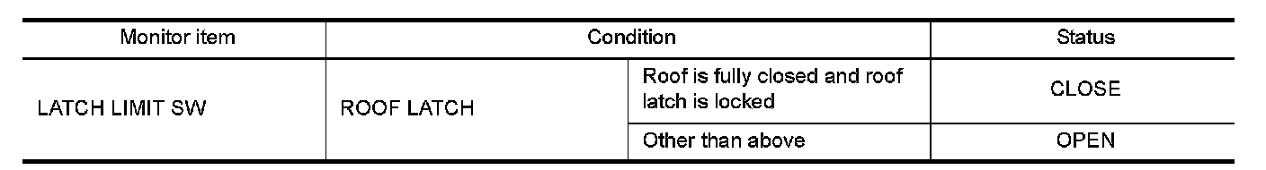 2.Check "LATCH LIMIT SW" in "Data Monitor" mode of "RETRACTABLE HARD TOP" using CONSULT.