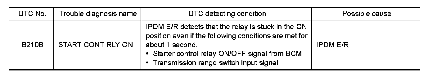 Starter control relay, integrated in IPDM E/R, permits the starter relay operation when in the N or P position and the steering is locked or unlocked (models with steering lock unit). It is installed parallel to the starter relay.