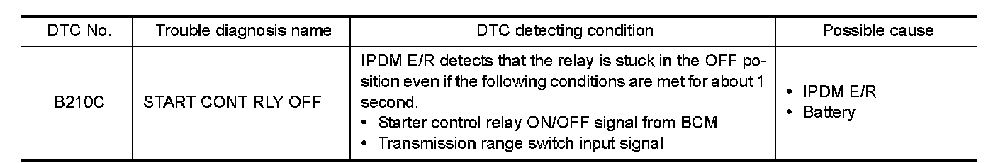 - When IPDM E/R power supply voltage is low (Approx. 7 - 8 V for about 1 second), the DTC B210C may be detected.