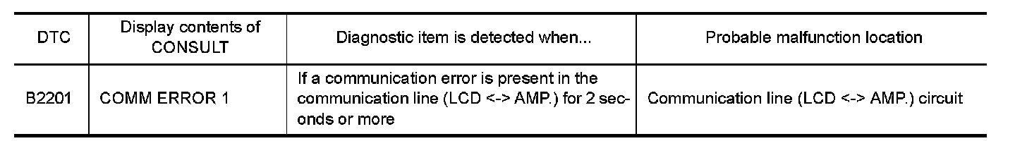 The communication line (LCD to and from AMP.) is used to communicate signals between the combination meter and the unified meter and A/C amp. in order to control the information display.