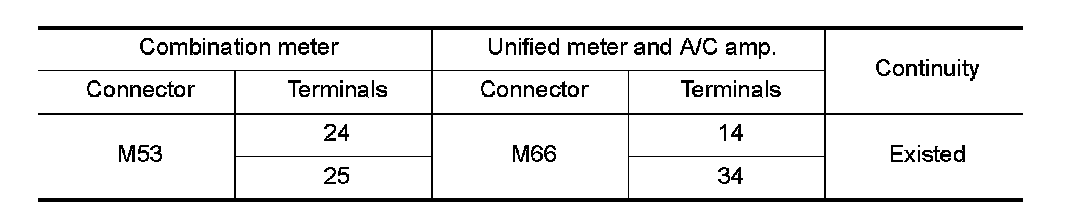 3.Check continuity between combination meter harness connector terminal and unified meter and A/C amp.