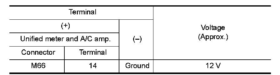 3.Check voltage between unified meter and A/C amp. harness connector terminal and ground.