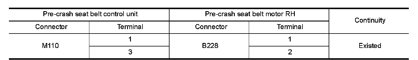 3.Check continuity between pre-crash seat belt control unit harness connector and pre-crash seat belt motor RH harness connector.